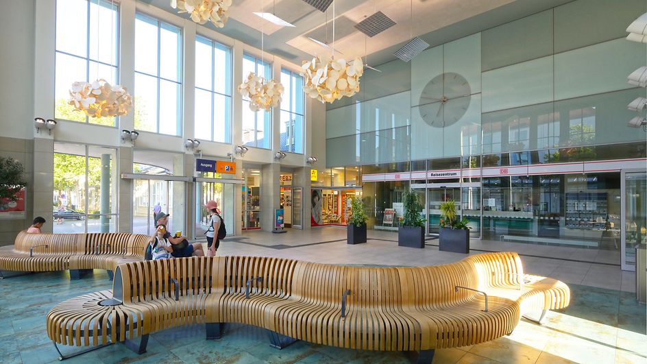 Der Blick in die Empfangshalle des Bahnhofs Ansbach nach der Aufwertung im Rahmen des Konzepts Zukunftsbahnhof (ZKB) durch verschiedene bauliche und gestalterische Maßnahmen. Foto am 10. August 2025